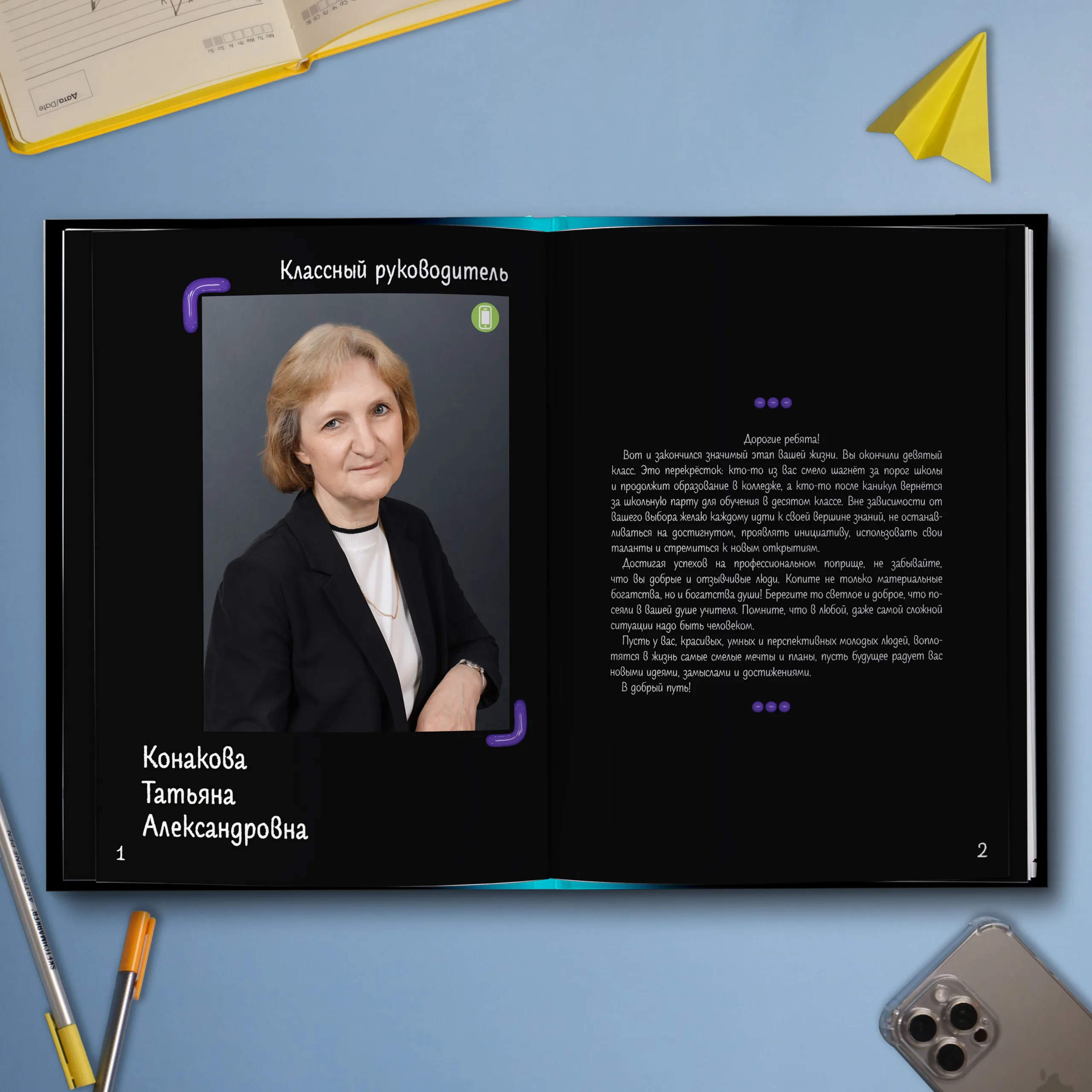 1ый разворот — фотография классного руководителя с напутственным словом